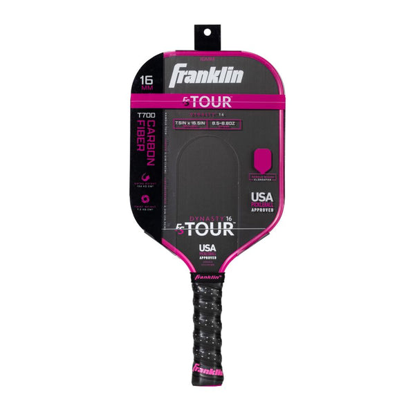 The Franklin FS Tour Dynasty Pickleball Paddle Series is engineered for competitive players seeking the perfect harmony of power, control, and stability. Each paddle features a T700 raw carbon fibre face that enhances spin and touch across the striking surface, while the precision polymer core and foam-injected perimeter expand the sweet spot for cleaner, more consistent contact. Available in both 14mm and 16mm configurations, the Dynasty series uses a unibody carbon frame to improve rigidity and reduce vibration — resulting in pro-level responsiveness across every shot.