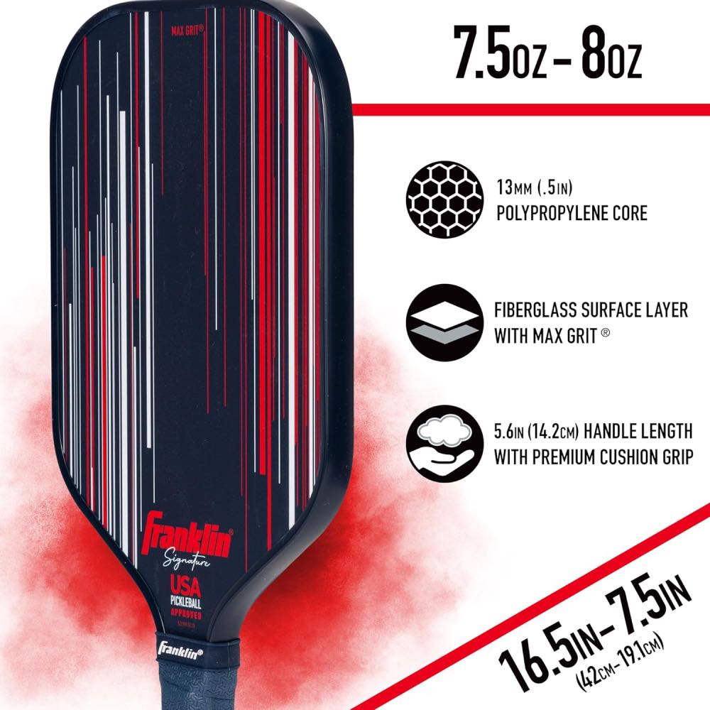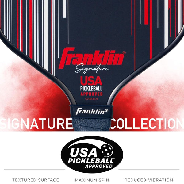 The Franklin Signature Pro Series Pickleball Paddle has been developed by Franklin’s roster of elite athletes for top-tier tournament play. Built around a polypropylene core and finished with Franklin’s MaxGrit textured surface, it enhances spin, control, and vibration dampening for smooth, precise shot-making. The 13mm core delivers a faster, more powerful response, while the 16mm version provides extra stability and control for technical play. Every paddle in the Signature Pro range is USA Pickleball approved and engineered to perform consistently at the highest competitive levels.