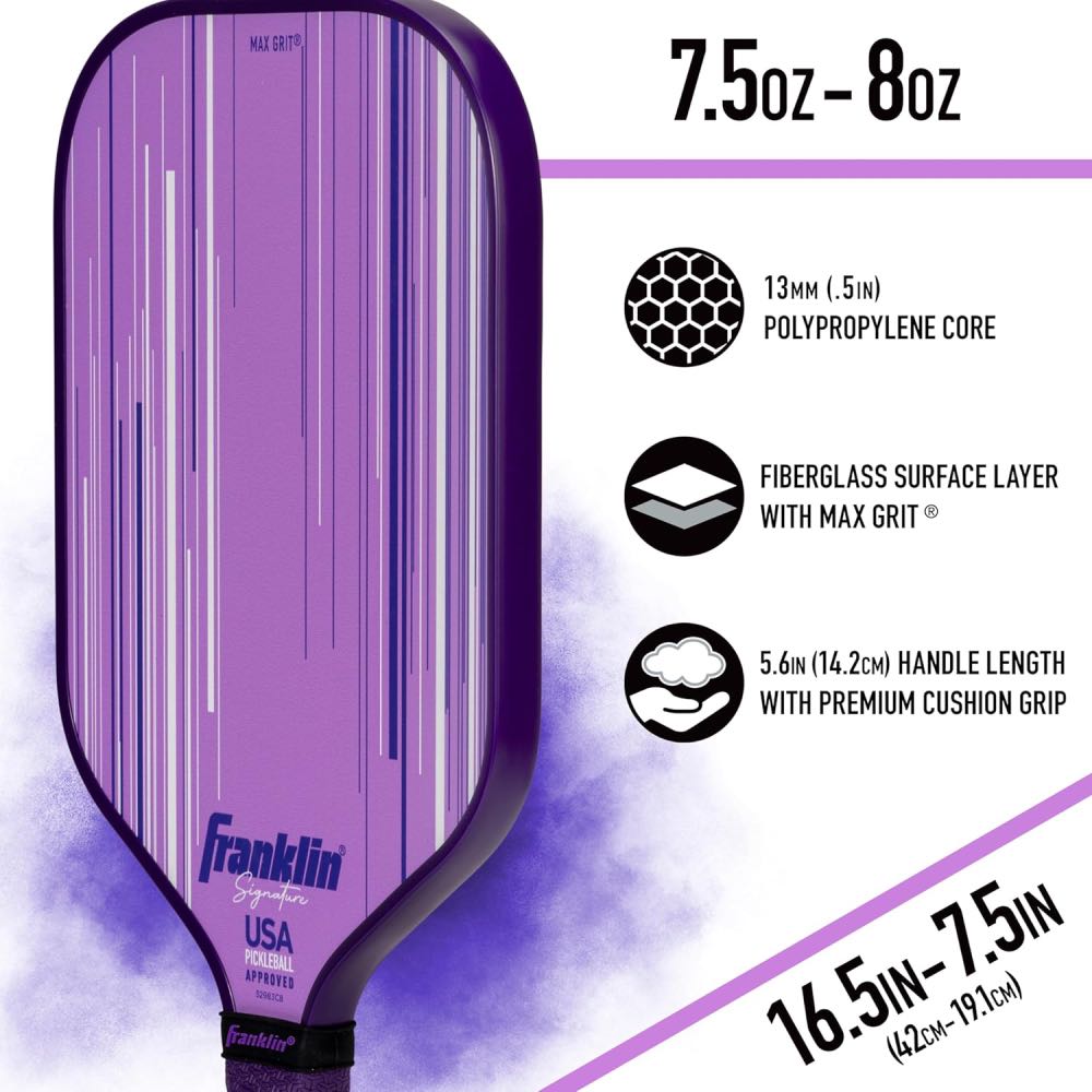 The Franklin Signature Pro Series Pickleball Paddle has been developed by Franklin’s roster of elite athletes for top-tier tournament play. Built around a polypropylene core and finished with Franklin’s MaxGrit textured surface, it enhances spin, control, and vibration dampening for smooth, precise shot-making. The 13mm core delivers a faster, more powerful response, while the 16mm version provides extra stability and control for technical play. Every paddle in the Signature Pro range is USA Pickleball approved and engineered to perform consistently at the highest competitive levels.