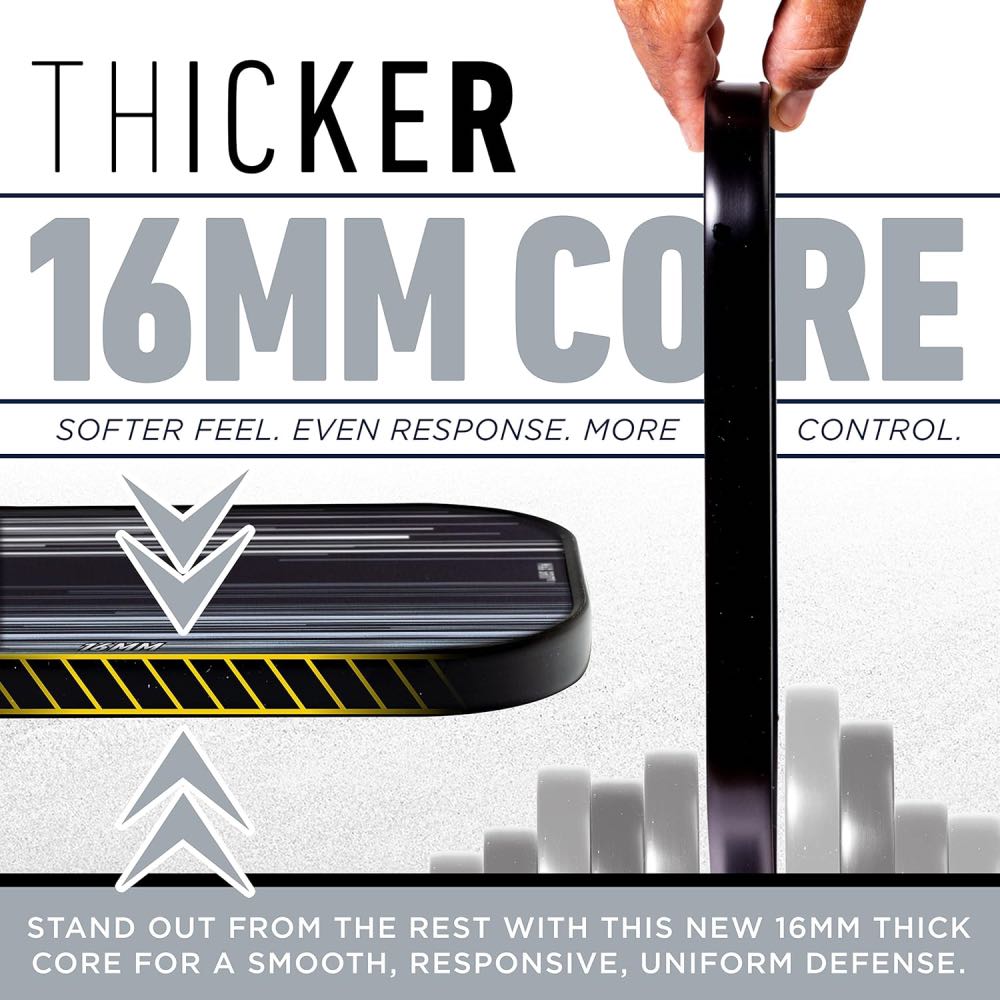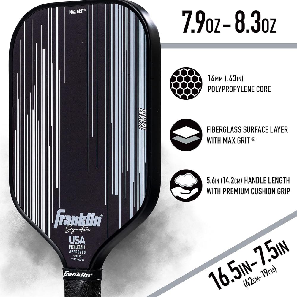 The Franklin Signature Pro Series Pickleball Paddle has been developed by Franklin’s roster of elite athletes for top-tier tournament play. Built around a polypropylene core and finished with Franklin’s MaxGrit textured surface, it enhances spin, control, and vibration dampening for smooth, precise shot-making. The 13mm core delivers a faster, more powerful response, while the 16mm version provides extra stability and control for technical play. Every paddle in the Signature Pro range is USA Pickleball approved and engineered to perform consistently at the highest competitive levels.