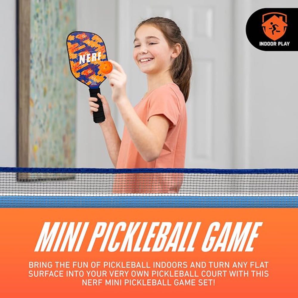 The Nerf Table Top Mini Pickleball Set turns almost any table into a compact pickleball court in seconds. Featuring a retractable net that extends up to 5 feet, it clamps securely into place with soft grip sides to protect surfaces. Supplied with two mini paddles and two balls, this complete indoor set delivers quick setup, easy storage, and fast-paced fun for players of all ages.