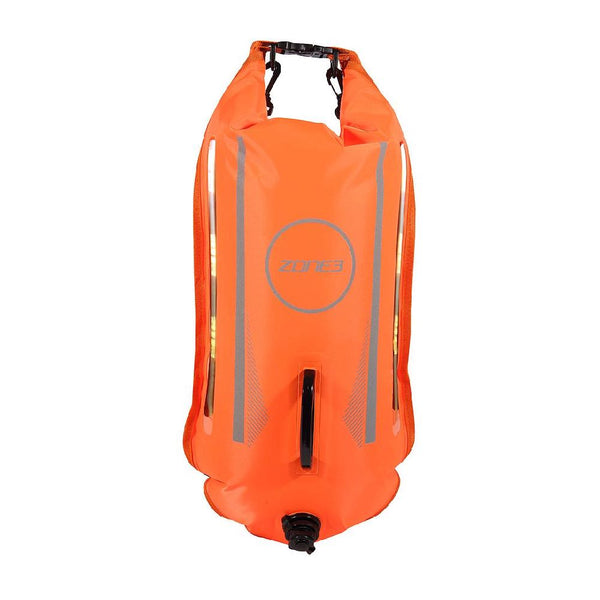 A 28L waterproof dry bag buoy with LED lighting, reflective detailing, and backpack straps, designed for safe and visible open water swimming.